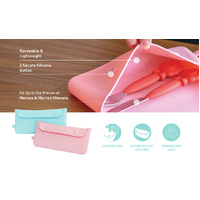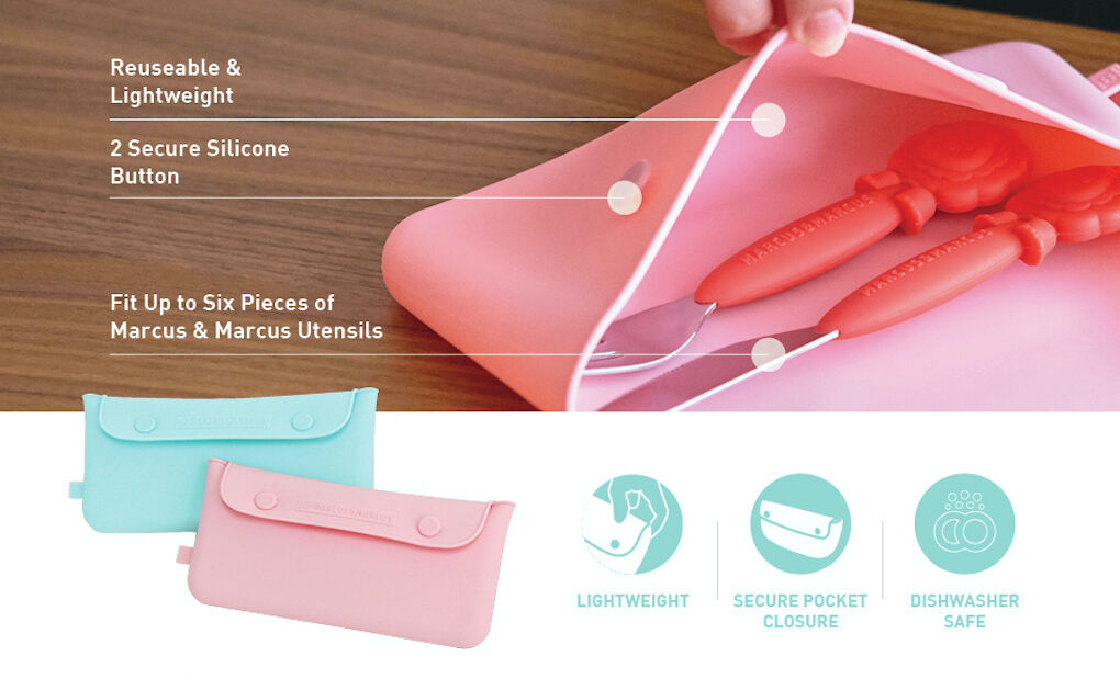 Marcus & Marcus cutlery pouch is the perfect accessory to go with your Marcus & Marcus cutlery sets. With our reusable silicone pouch, you can bring up to six pieces of Marcus & Marcus utensils with you wherever you go and pack them up without having to worry about making a mess in your bag. Two secure silicone buttons keep the pouch sealed tightly so you have peace-of-mind that your cutlery is clean when you take them out and secure when you put them away. The silicone pouch is easy to wash in the dishwasher or with some hot soapy water. Marcus & Marcus's Cutlery Pouch is molded from BPA and Phthalate free materials. Choose from Pink or Blue.
